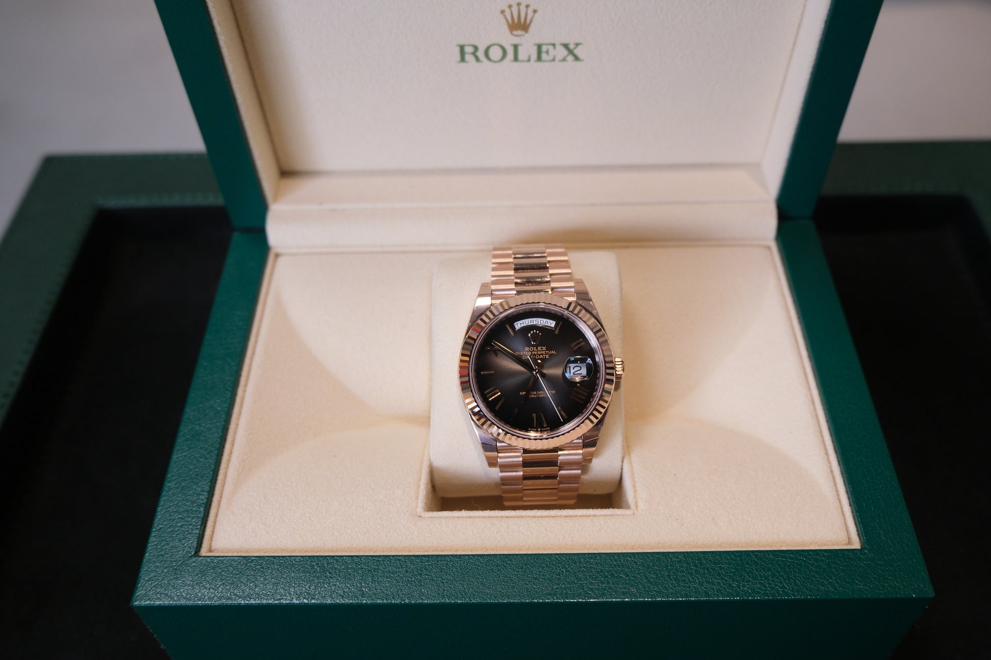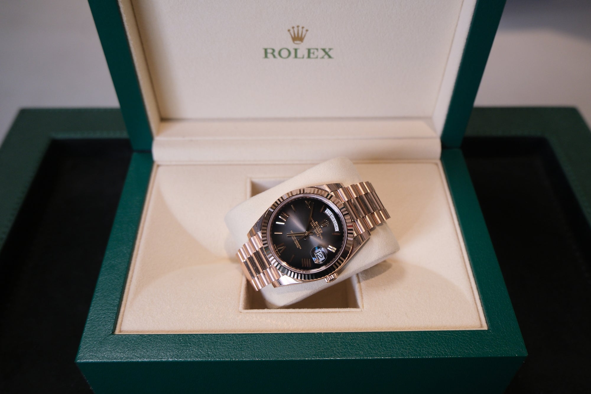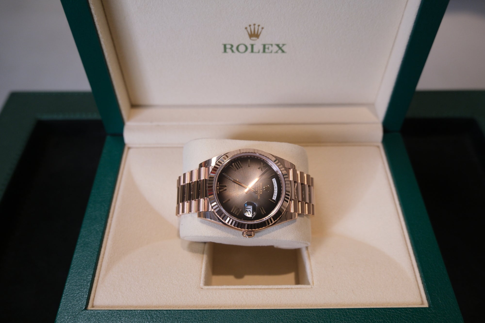 The Rolex Day-Date 40 “Black Ombre,” reference 228235, is a bold and refined expression of Rolex’s most prestigious model. Crafted entirely in 18k Everose gold, this configuration pairs luxurious materials with a unique black ombré dial that fades beautifully from deep black at the edges to a softer gradient at the center—giving it unmatched depth and sophistication.