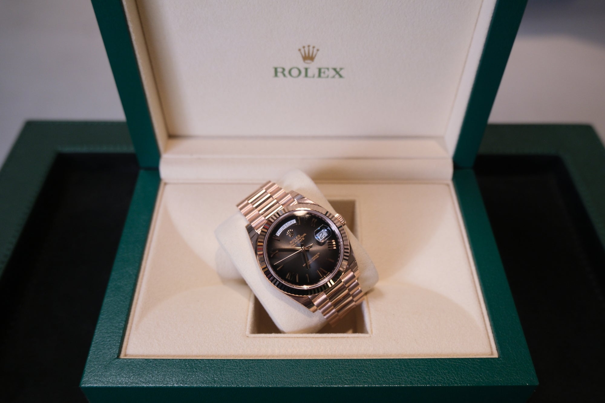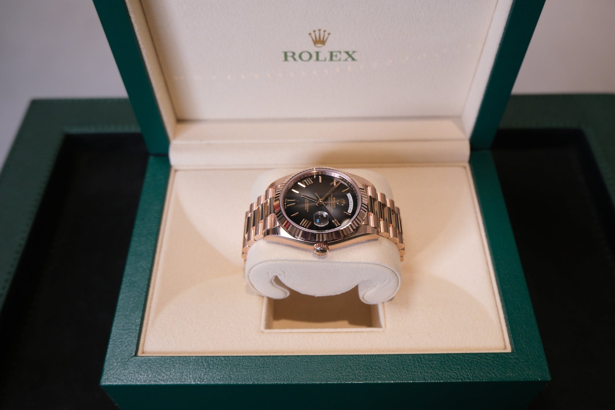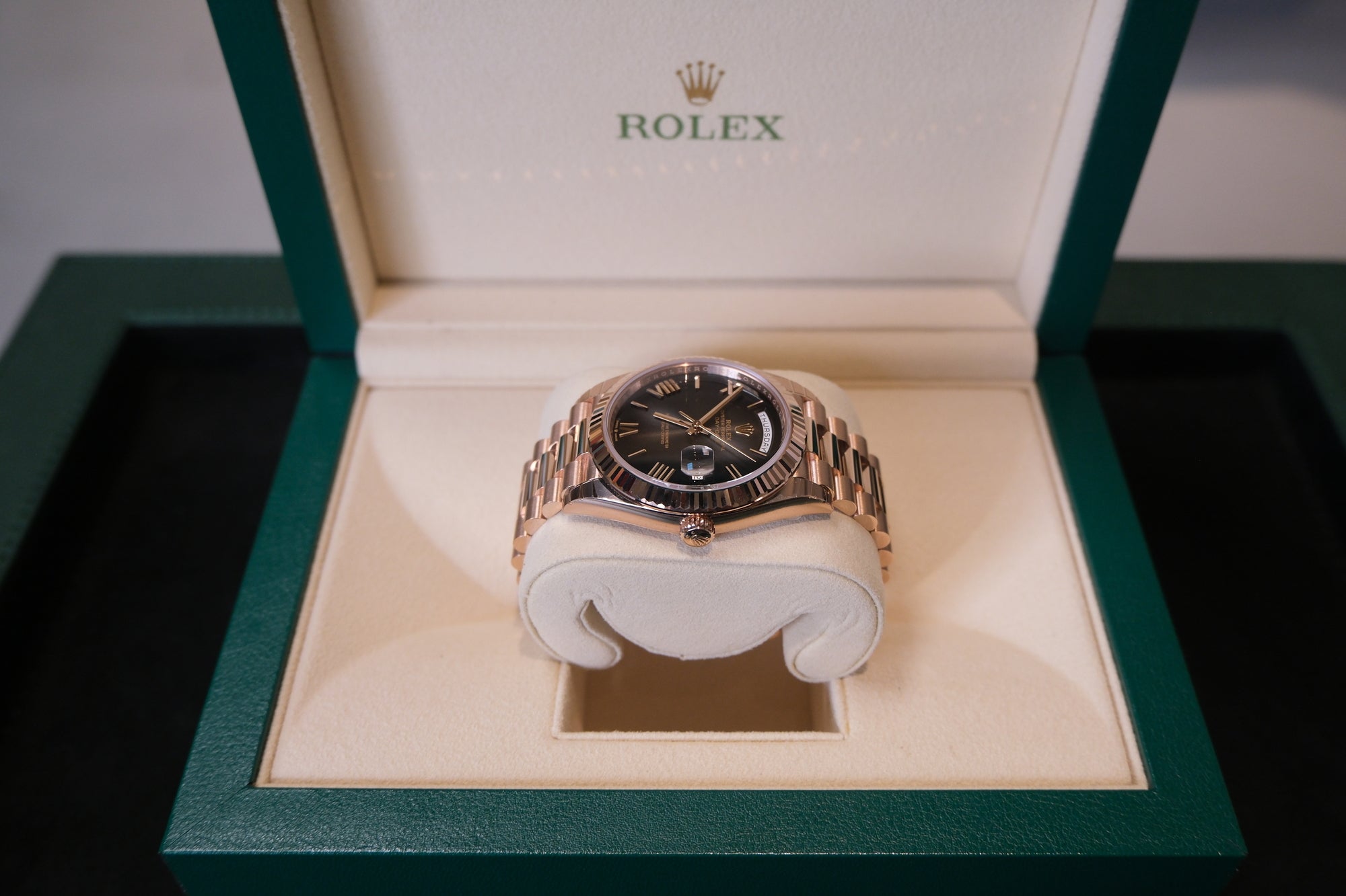 The Rolex Day-Date 40 “Black Ombre,” reference 228235, is a bold and refined expression of Rolex’s most prestigious model. Crafted entirely in 18k Everose gold, this configuration pairs luxurious materials with a unique black ombré dial that fades beautifully from deep black at the edges to a softer gradient at the center—giving it unmatched depth and sophistication.