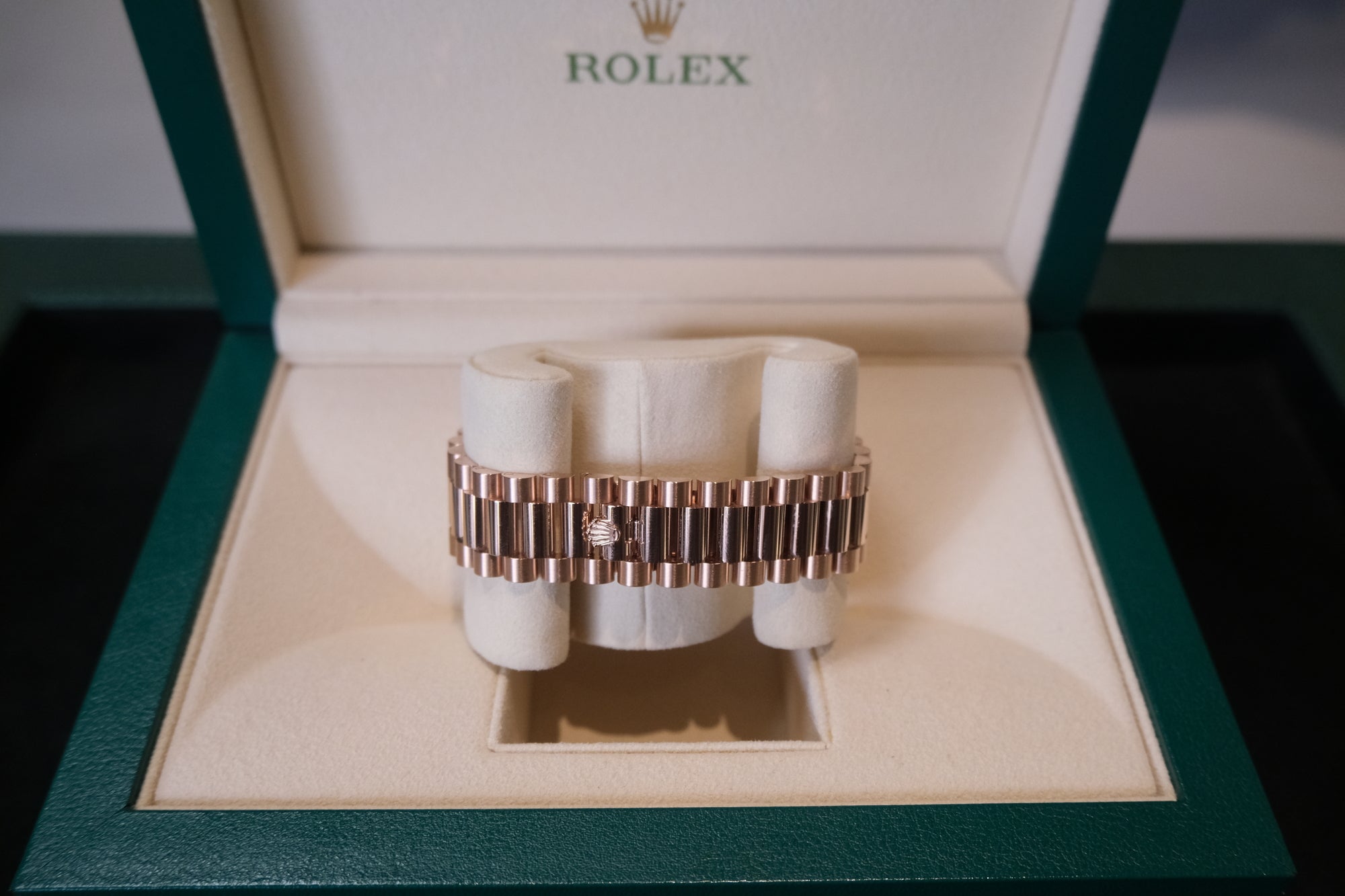 The watch is fitted with the prestigious President bracelet, exclusive to the Day-Date line. Its semi-circular three-piece links provide unmatched comfort and refined presence, while the concealed Crownclasp ensures a seamless, elegant look on the wrist.